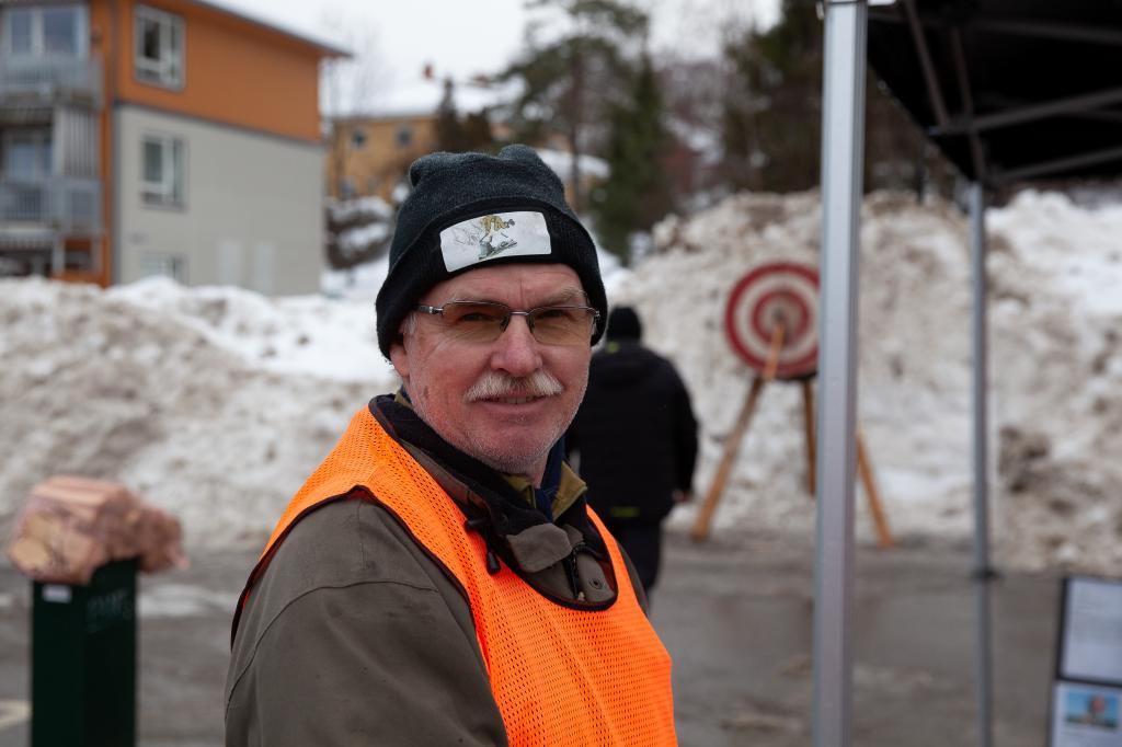 DOMMER OG ØKSEKASTER: Jan Frode løkken er både dommer i vedkløyvving og deltaker i øksekastingen.